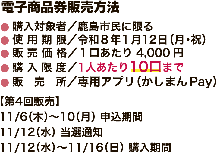 商品券販売に先立ち、鹿島市内に事業所または店舗がある事業者の方を対象に、商品券を使用できる「商品券取扱店」を募集します。 取扱店の登録方法や条件等の概要は、「 取扱店登録希望の方 」をご覧ください。