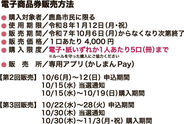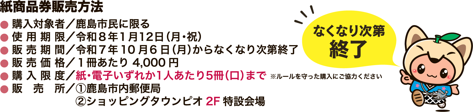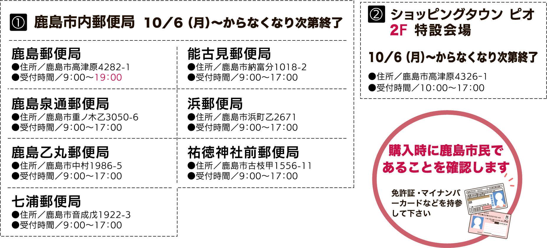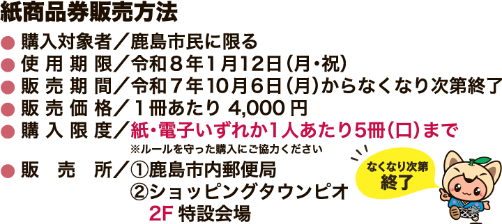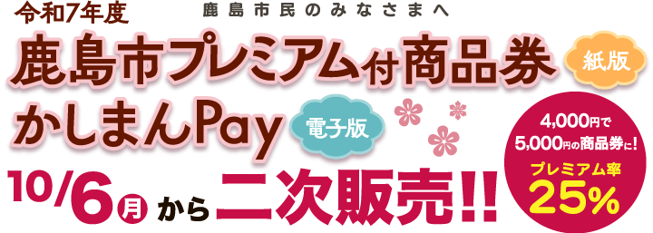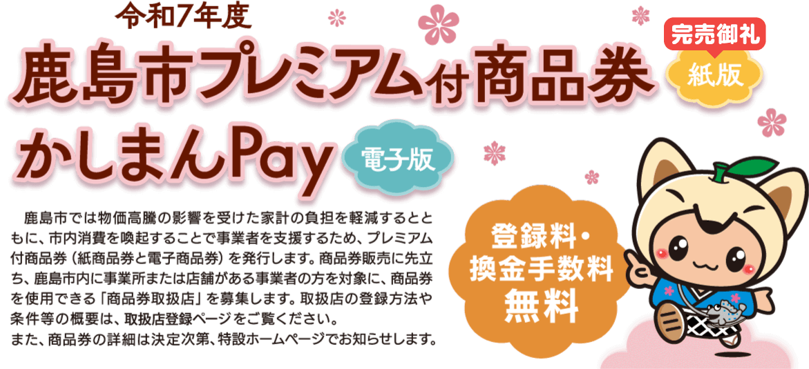 商品券販売に先立ち、鹿島市内に事業所または店舗がある事業者の方を対象に、商品券を使用できる「商品券取扱店」を募集します。 取扱店の登録方法や条件等の概要は、「 取扱店登録希望の方 」をご覧ください。