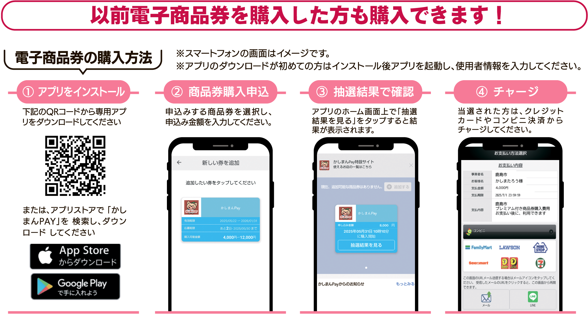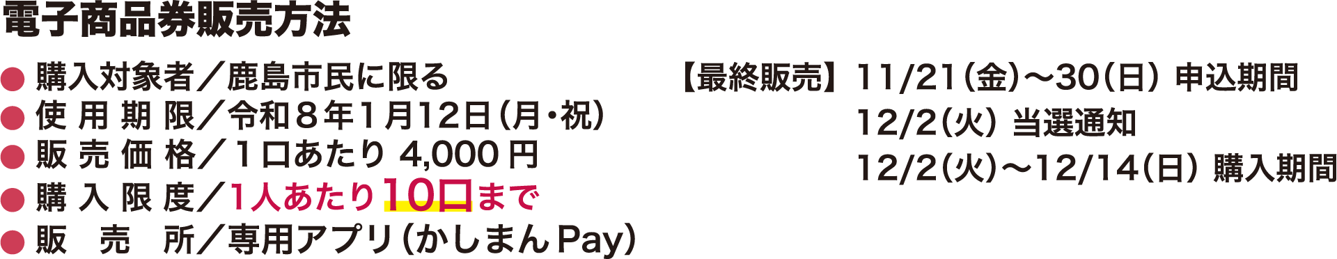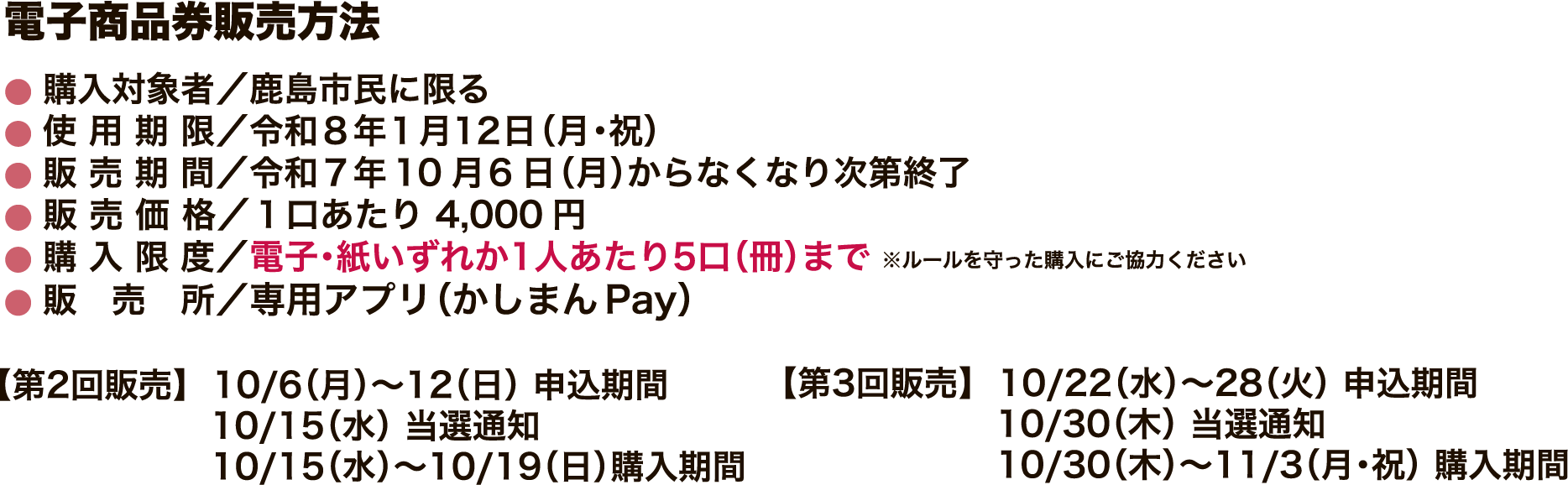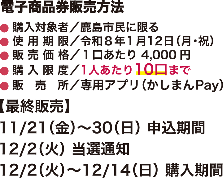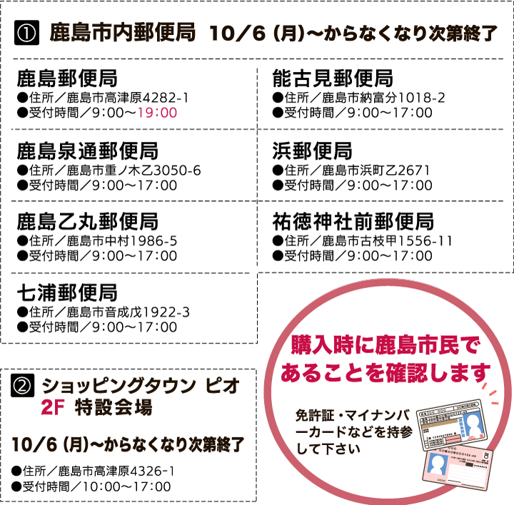 商品券販売に先立ち、鹿島市内に事業所または店舗がある事業者の方を対象に、商品券を使用できる「商品券取扱店」を募集します。 取扱店の登録方法や条件等の概要は、「 取扱店登録希望の方 」をご覧ください。