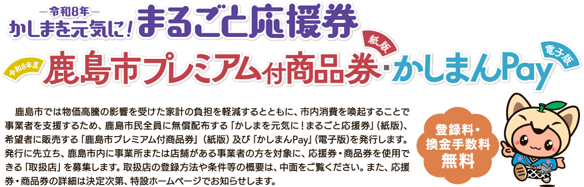 商品券販売に先立ち、鹿島市内に事業所または店舗がある事業者の方を対象に、商品券を使用できる「商品券取扱店」を募集します。