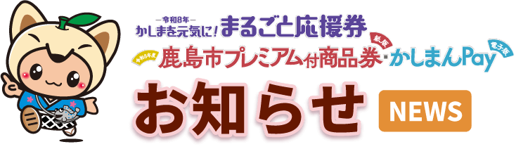 鹿島市まるごと応援券・プレミアム付商品券の取扱店を募集します。詳しくは「取扱店登録希望の方」をご覧ください。なお、令和7年度のプレミアム付商品券取扱店様には個別に継続確認を行っておりますので登録は不要です。