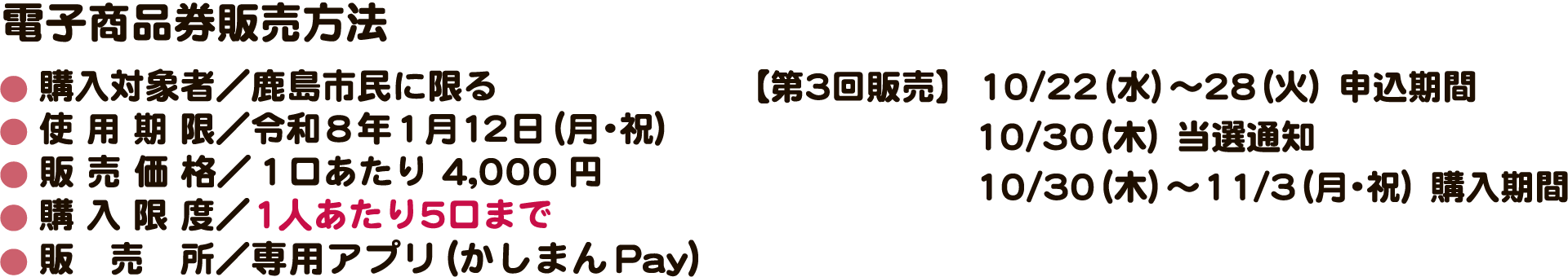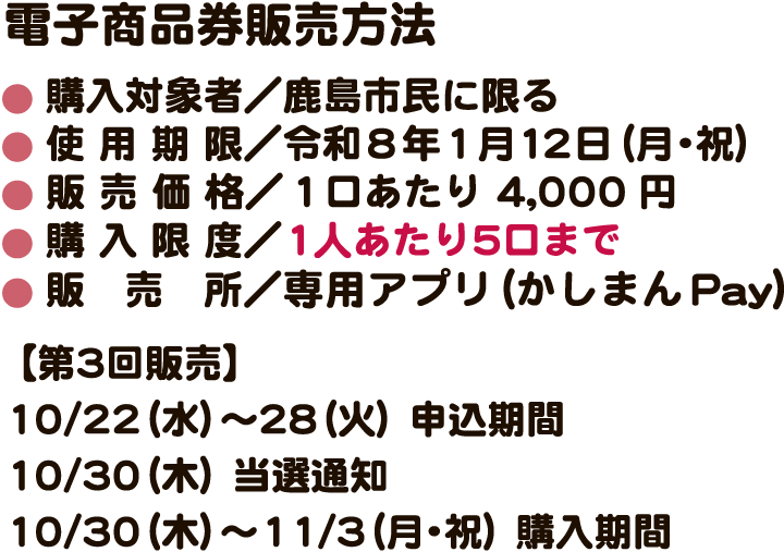 商品券販売に先立ち、鹿島市内に事業所または店舗がある事業者の方を対象に、商品券を使用できる「商品券取扱店」を募集します。 取扱店の登録方法や条件等の概要は、「 取扱店登録希望の方 」をご覧ください。